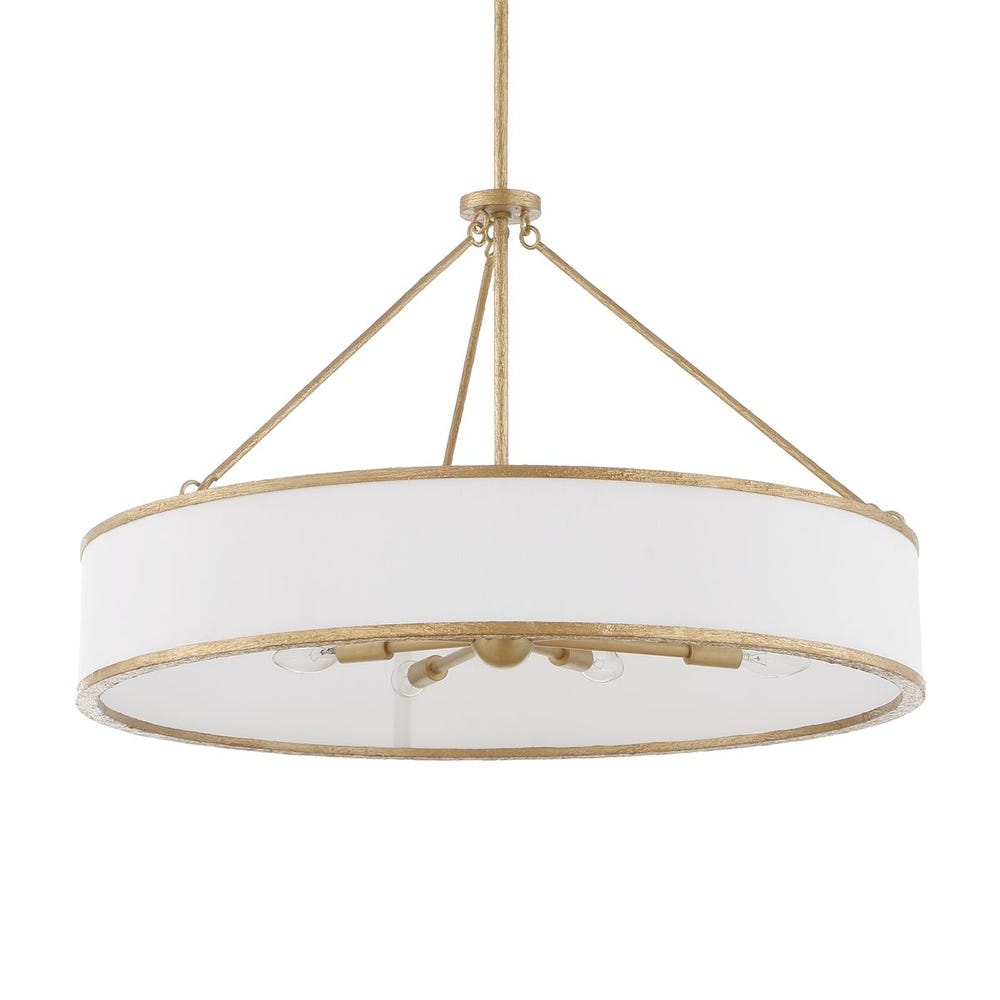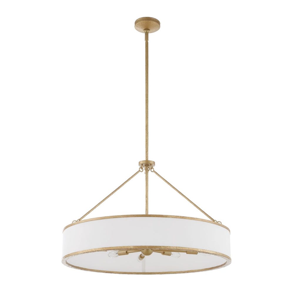 Elevate your living space with the Algiers 8-Light Pendant, featuring a narrow hardback shade crafted from pristine white linen fabric. This elegant pendant is accented by a heavy textured soft gold finish, adding a layer of refined warmth and sophistication. Equipped with eight candelabra sockets, it accommodates bulbs up to 40 watts each (bulbs not included), providing ample illumination for dining rooms, foyers, or living areas. Designed to harmonize with both classic and contemporary interiors, the Algiers pendant delivers timeless style and graceful ambience to your home.
