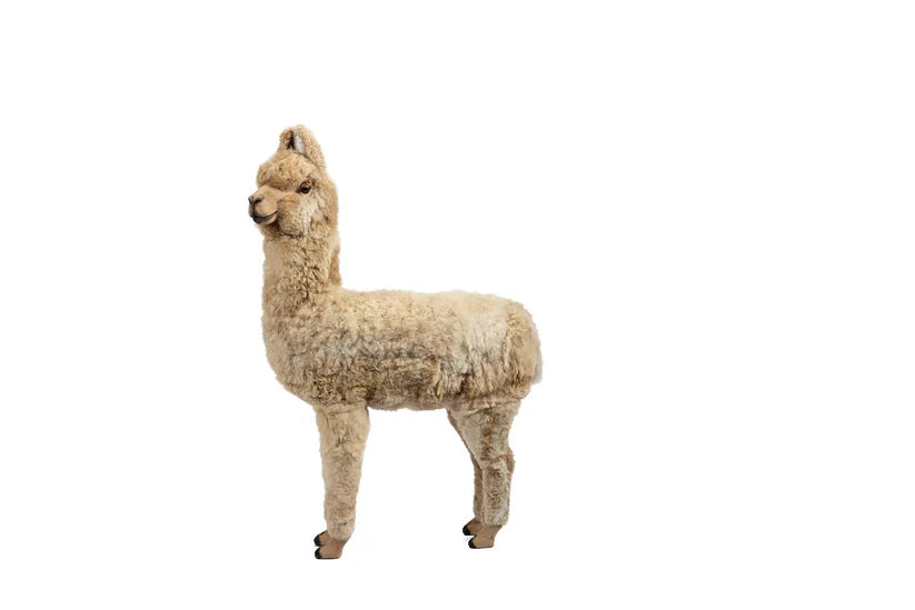 Handcrafted from premium Suri wool in its natural, undyed state, this alpaca sculpture combines artisanal craftsmanship with enduring appeal. The robust fiberglass internal structure provides reliable stability, while the six-piece modular design invites an engaging assembly experience. Available in three sophisticated finishes—beige, ivory, and linen—and three impressive heights spanning 35" to 67", this piece adapts to diverse interior schemes. Each sculpture reflects the meticulous work of skilled artisans dedicated to quality construction. Whether displayed as a statement accent or presented as a distinctive gift, this alpaca figurine brings refined, nature-inspired character to residential and commercial environments alike.