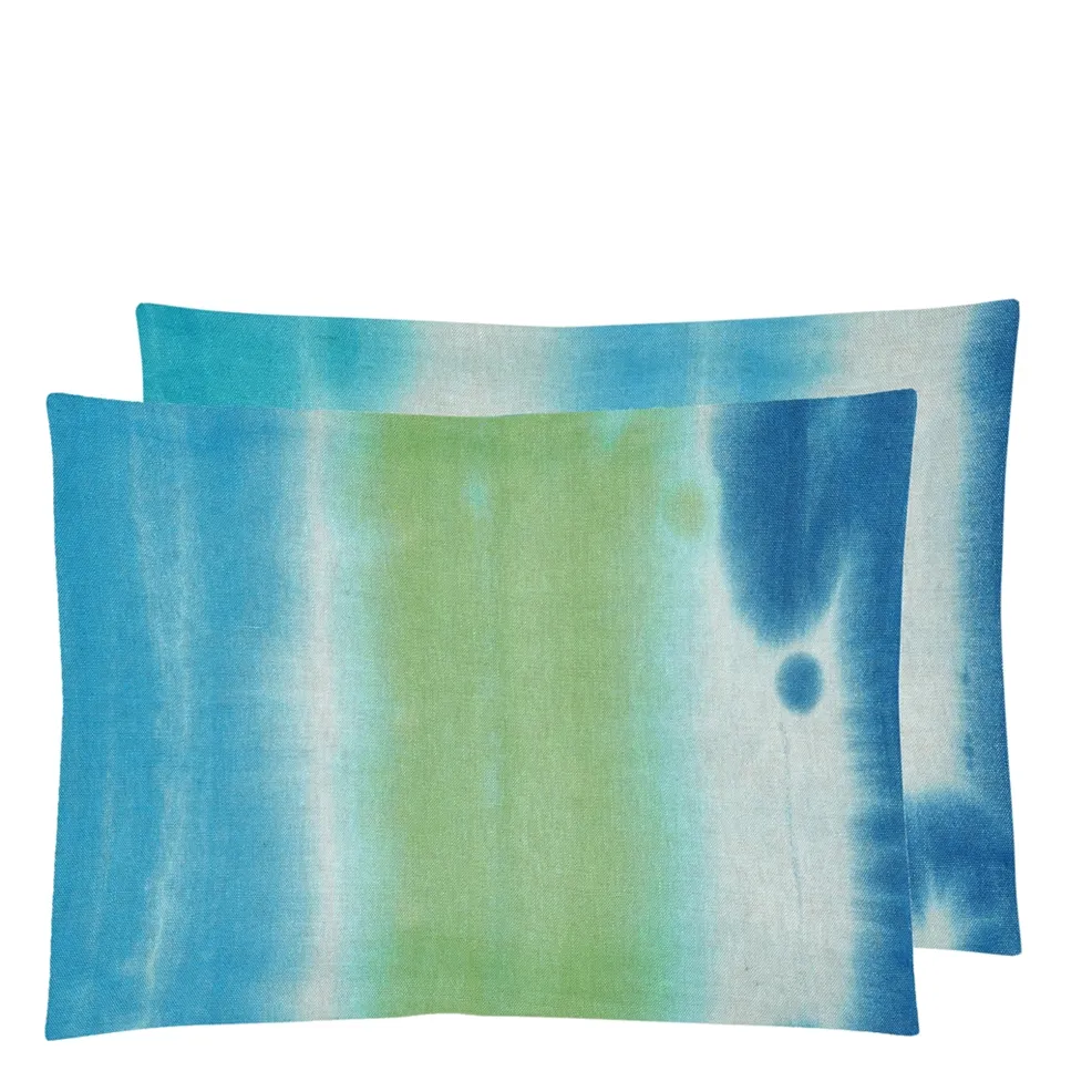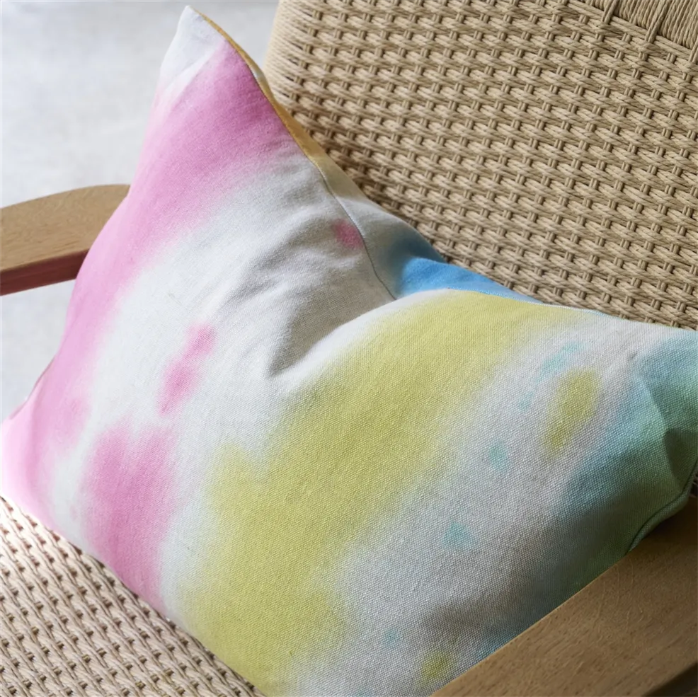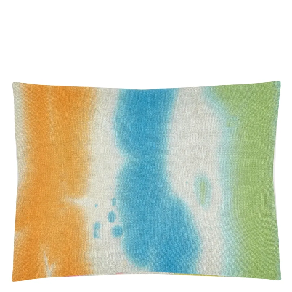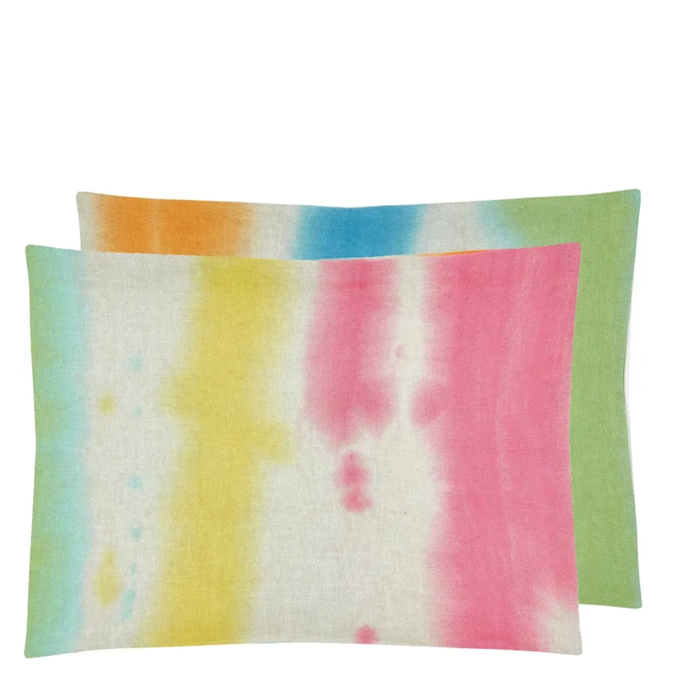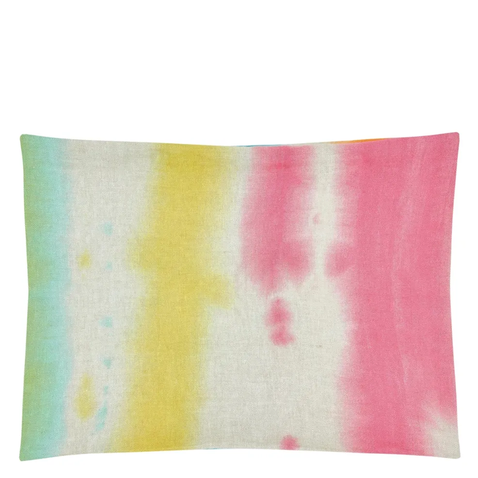 This rectangular linen decorative pillow showcases a distinctive spray-printed stripe pattern, executed through an artisanal production technique that celebrates handcrafted imperfection. Vibrant tones of fuchsia pink, lime, aqua, and orange are meticulously applied to our signature Brera Lino—a premium 100% linen fabric renowned for its luxuriously tumbled finish that softens with use. Each pillow is a singular creation, as the specialized spray-print method ensures no two pieces are identical. The variation in stripe placement and color saturation across the surface adds depth and visual intrigue, making this an exceptional choice for designers and homeowners seeking distinctive textiles. The natural linen construction provides durability alongside a refined aesthetic, while the bold color palette effortlessly complements contemporary and eclectic interiors. Perfect for layering on sofas, beds, or accent seating, this pillow merges artistic craftsmanship with functional elegance.