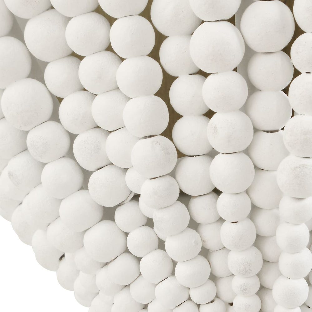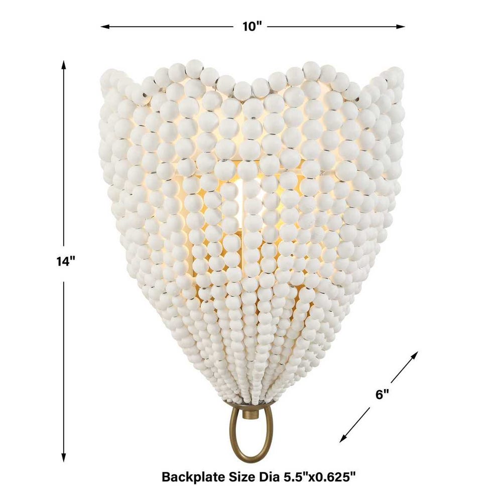 The Biddeford Sconce elevates any space with its elegant design and refined craftsmanship. This one-light fixture showcases a scalloped shade composed of seven different sizes of matte white wood beads, carefully interwoven to create a textured, three-dimensional effect. The brushed matte gold finish adds a subtle warmth and luxurious touch, perfectly balancing modernity with timeless appeal. Ideal for living rooms, hallways, or bedrooms, this sconce casts a soft, inviting glow that enhances the ambiance and adds a sophisticated accent to your interior decor.