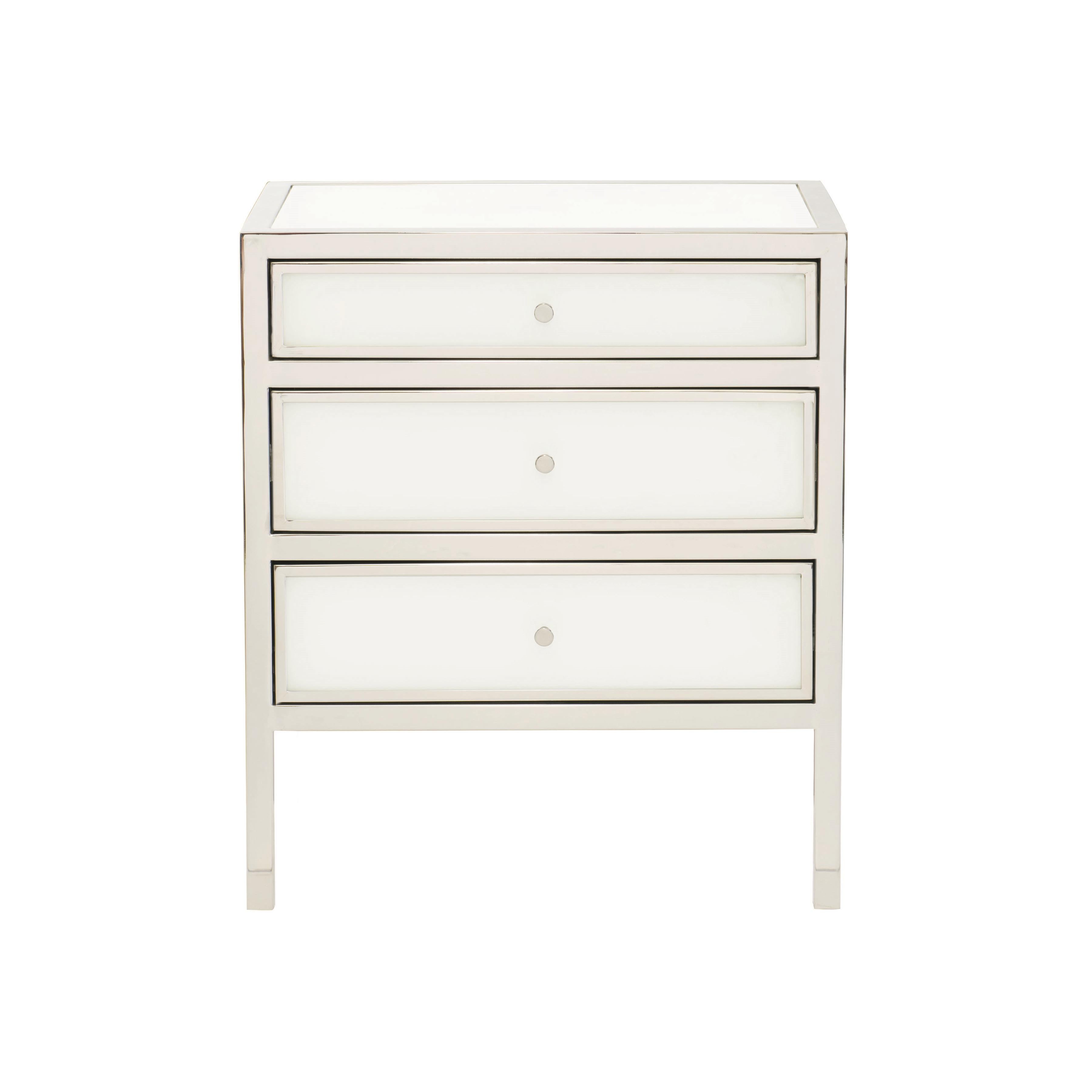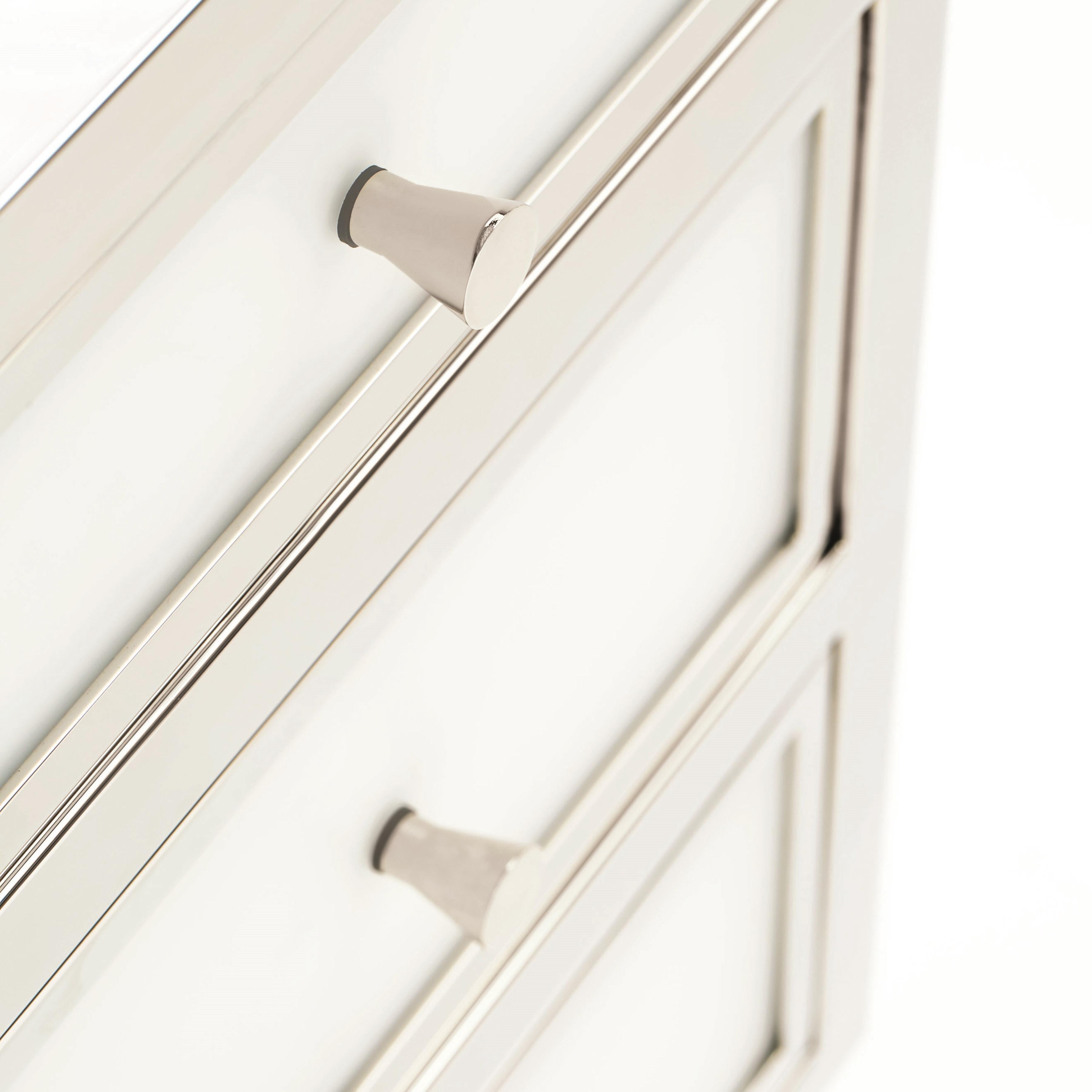 Bernhardt Interiors brings you the Blanca Nightstand—a perfect blend of style and function for modern living spaces. This three-drawer nightstand features polished stainless steel accents combined with inset snow glass panels, creating a sleek and luminous design. Its understated elegance enhances any bedroom decor, offering ample storage while maintaining a clean and contemporary aesthetic. Ideal for those who appreciate refined craftsmanship and distinctive details, the Blanca Nightstand adds both practical charm and sophisticated flair to your home. Elevate your bedroom ambiance with this exquisite piece that balances form and function effortlessly.