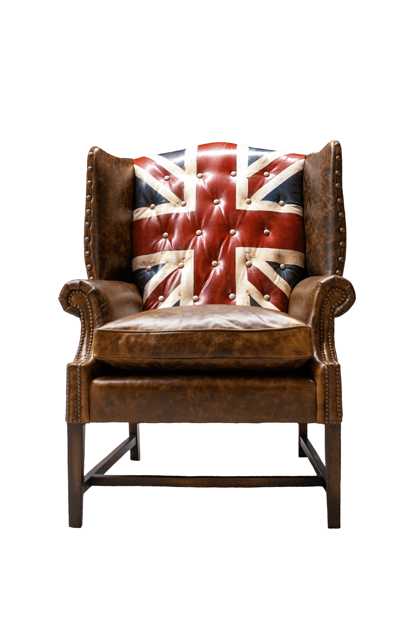 This bespoke leather chair combines traditional craftsmanship with distinctive design elements. Each piece features premium leather upholstery paired with a hand-painted British flag motif on the backrest, creating a striking focal point. The chair is supported by sturdy legs finished in natural wood tones and accented with brass nail head detailing that adds refined sophistication. Custom-made to order, this statement piece works beautifully in libraries, studies, or living spaces where you want to showcase personality and heritage. The quality construction ensures lasting comfort and durability, while the iconic flag design serves as a conversation starter that celebrates British style and character.