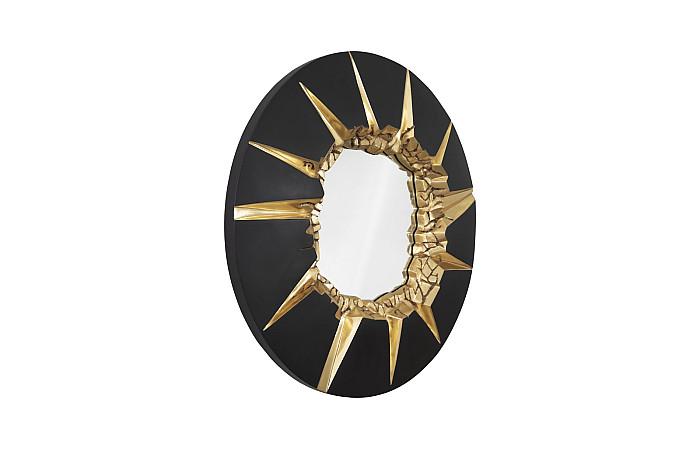 The Circular Cracked Black and Gold Mirror features a frame that appears fractured, unveiling a radiant inner glow. Crafted from composite, its round design combines matte black and gold leaf finishes. The striking contrast between the deep black and shining gold adds a distinctive element to any space, enhancing thoughtful interior design. The textured, organically shaped gold section encircling the mirror adds a refined design touch. This piece truly embodies the modern organic style central to the Phillips Collection’s aesthetic.