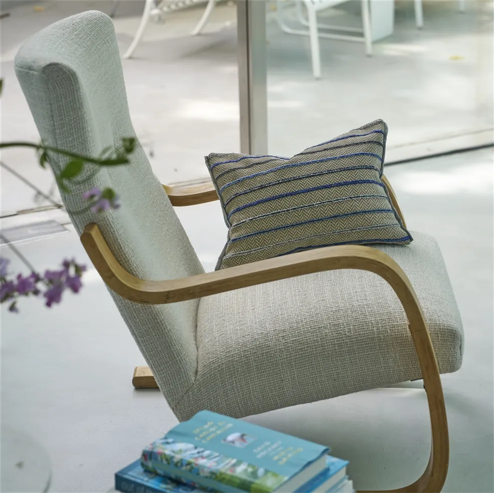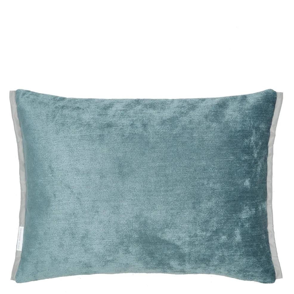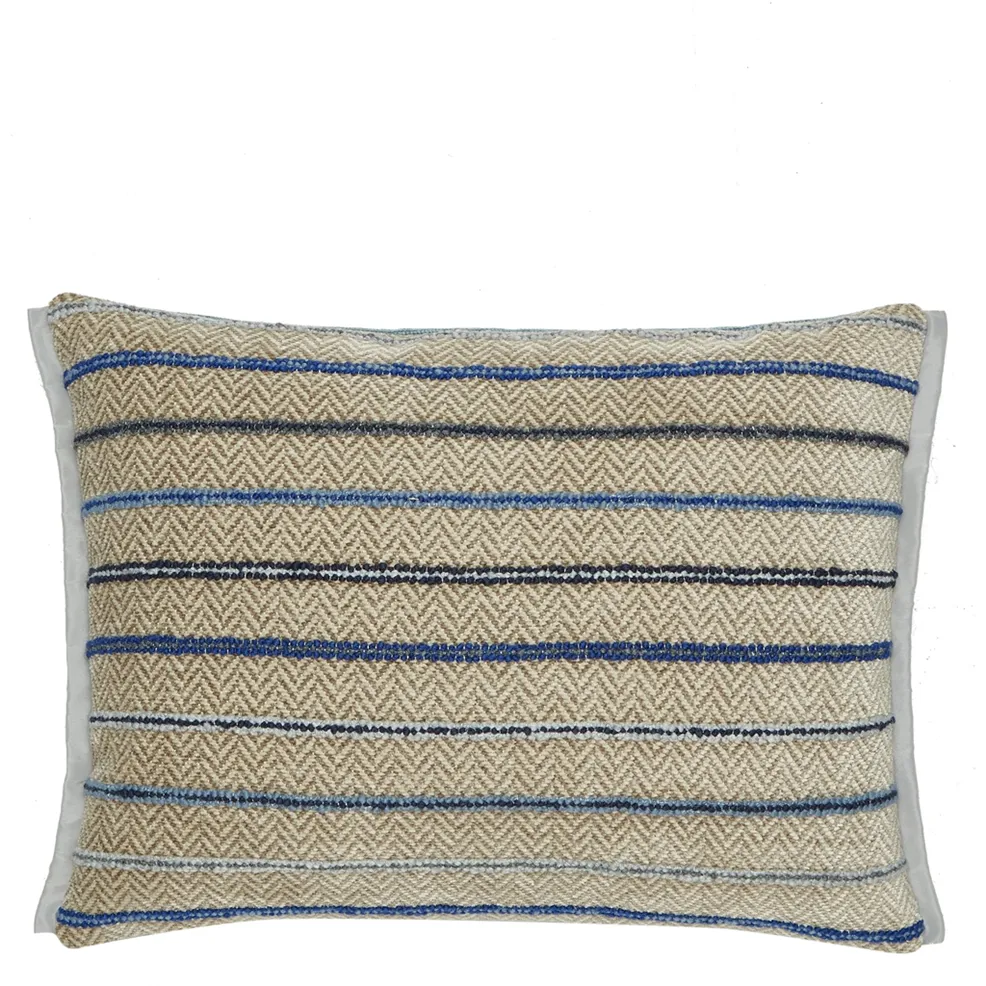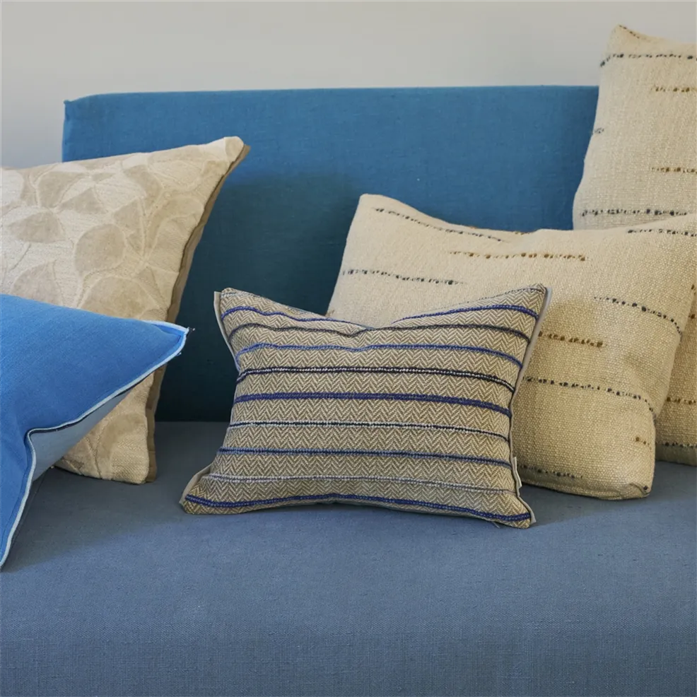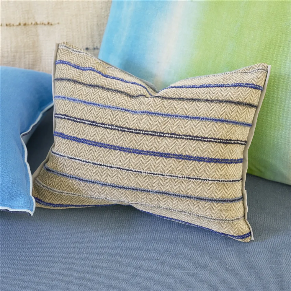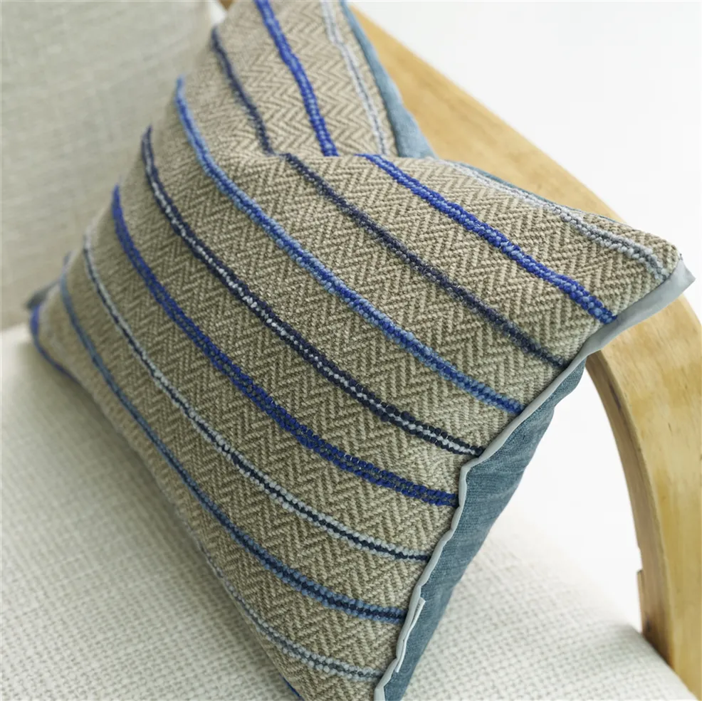 This sophisticated cobalt-inspired decorative pillow exemplifies contemporary design through its thoughtfully layered aesthetic. The piece showcases digitally printed multi-colored shaded stripes rendered on premium pure cotton satin, creating a refined foundation for the design. Expertly embroidered contrasting stitched bands in vibrant fuchsia and moss tones add dimensional texture, while delicate gold thread accents introduce subtle luminosity throughout. The reverse side features a complementary Carlyon olive tone, offering versatile styling options. Finished with luxurious moss fringing on two sides, this pillow combines technical precision with artisanal craftsmanship, making it an ideal accent piece for discerning interiors seeking both visual interest and quality construction.