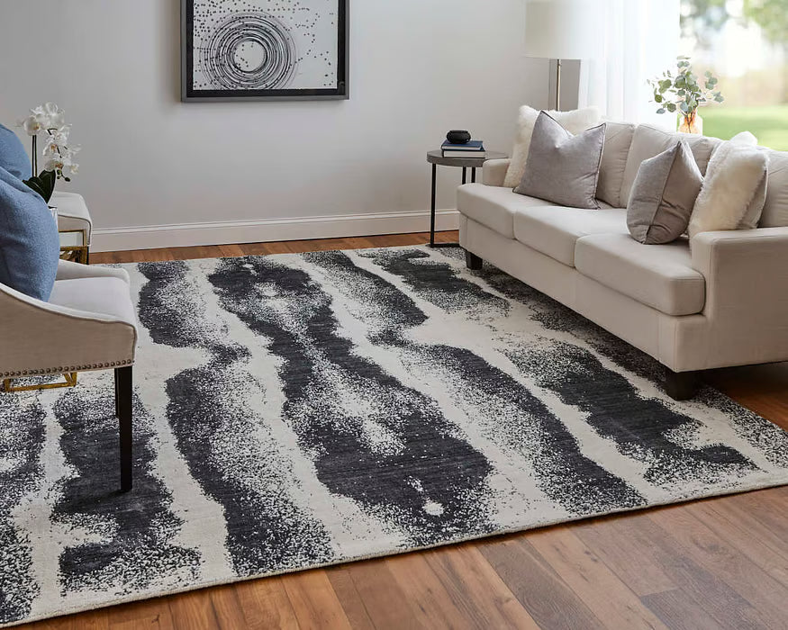 Hand-woven from a blend of wool and viscose, the Coda Lifestyle Rug in Black and White offers a sophisticated fusion of texture and design. Its abstract, contemporary pattern features a striking high-contrast palette of black, white, and charcoal, making a bold statement in any interior. The durable wool fibers ensure excellent fade resistance, maintaining the rug's vibrant look over time, while the viscose adds a subtle sheen that enhances its artistic appeal. Perfect for modern living spaces, this rug combines durability with refined style, elevating your décor with its dynamic graphic presence and luxurious feel.
