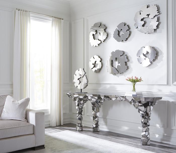 The Crazy Cut Console Table exemplifies elegance through its seamless blend of natural curves and contemporary craftsmanship. Inspired by organic rock formations, this piece features a resin body adorned with meticulously hand-placed stainless steel accents. Its substantial size commands attention, bringing a striking asymmetrical design that sets the tone for your entire décor. Part of the Crazy Cut Collection, this table embodies the Phillips Collection’s signature modern organic style, promising to be a standout element in any design scheme.