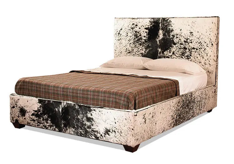 This queen-sized Hair Hide Bed features a dramatic black-and-white patterned upholstery that commands attention while maintaining refined sophistication. The contrasting black support legs anchor the piece with clean, contemporary lines that complement modern interiors. Crafted from premium hair hide material, this bed combines aesthetic impact with practical durability—the surface resists everyday wear and cleans effortlessly, preserving its luxurious appearance indefinitely. An ideal choice for discerning homeowners who prioritize both visual presence and long-lasting quality in their bedroom furnishings.