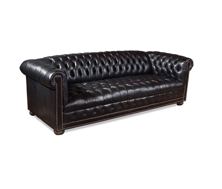 Elevate your living space with this custom-made brown-black leather sofa, expertly crafted to combine timeless elegance with modern comfort. Featuring tufted accents that add a refined texture, this sofa showcases leg finishes in a rich deep red complemented by burgundy brown hues, creating a visually striking yet harmonious palette. Natural finish nail heads highlight the design with subtle, classic detailing. Perfect for sophisticated interiors, this leather sofa offers both durability and style, making it an ideal centerpiece for any upscale home or lounge area.