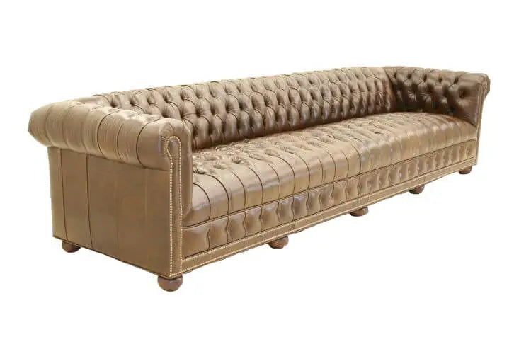 Elevate your living space with this custom-made leather sofa, available in sophisticated taupe or classic brown finishes. The plush leather offers a luxurious feel while ensuring durability and comfort. Its elegantly tufted legs are finished in a rich red tone with subtle burgundy and brown hues, adding a distinctive and refined touch. Complemented by natural-finish nailhead accents, this sofa blends timeless craftsmanship with modern style, making it a perfect centerpiece for any upscale interior. Experience comfort and elegance combined in one exquisite piece designed to enhance your home’s ambiance.