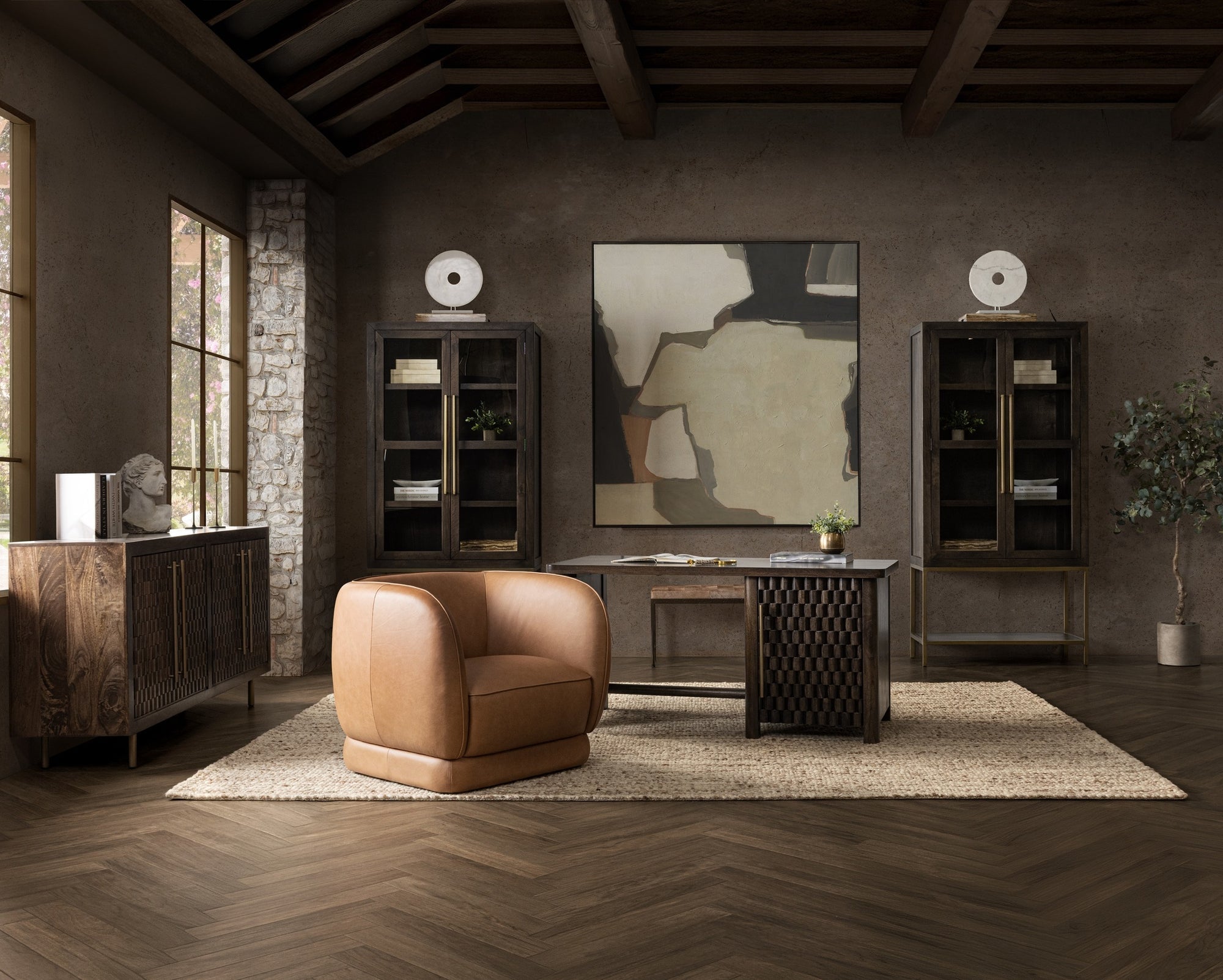 The Norwood Solid Wood Desk from the Norwood Collection combines contemporary elegance with durable craftsmanship. Crafted from solid mango wood, this desk features a distinctive block door pattern enhanced by subtle brass metal accents, adding a refined touch to your workspace. Its sleek, modern design not only elevates the aesthetic of any room but also creates an inviting and organized environment for productivity. Perfect for home offices or creative spaces, the Norwood desk offers both style and functionality, making it an essential piece for those seeking a polished and sophisticated retreat.