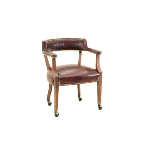 Elevate your living space with this exquisite custom-made leather chair, upholstered in a rich reddish-brown tone that exudes timeless elegance. The chair features brown/black hue finished legs accented by natural finish nail heads, adding subtle sophistication and craftsmanship to its design. Practical coasters attached to the legs allow effortless mobility while protecting your floors, blending style with functionality. Perfect for a refined living room or office, this chair offers both comfort and a distinctive statement piece to enhance any interior.