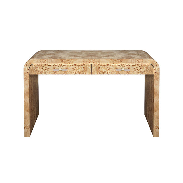 Behold the wondrous details of our Petra desk. A gorgeous burl wood veneer with a matte finish cascades down the waterfall edge, and two discreet drawers with acrylic hardware nest within. An immediate upgrade to your work from home style!