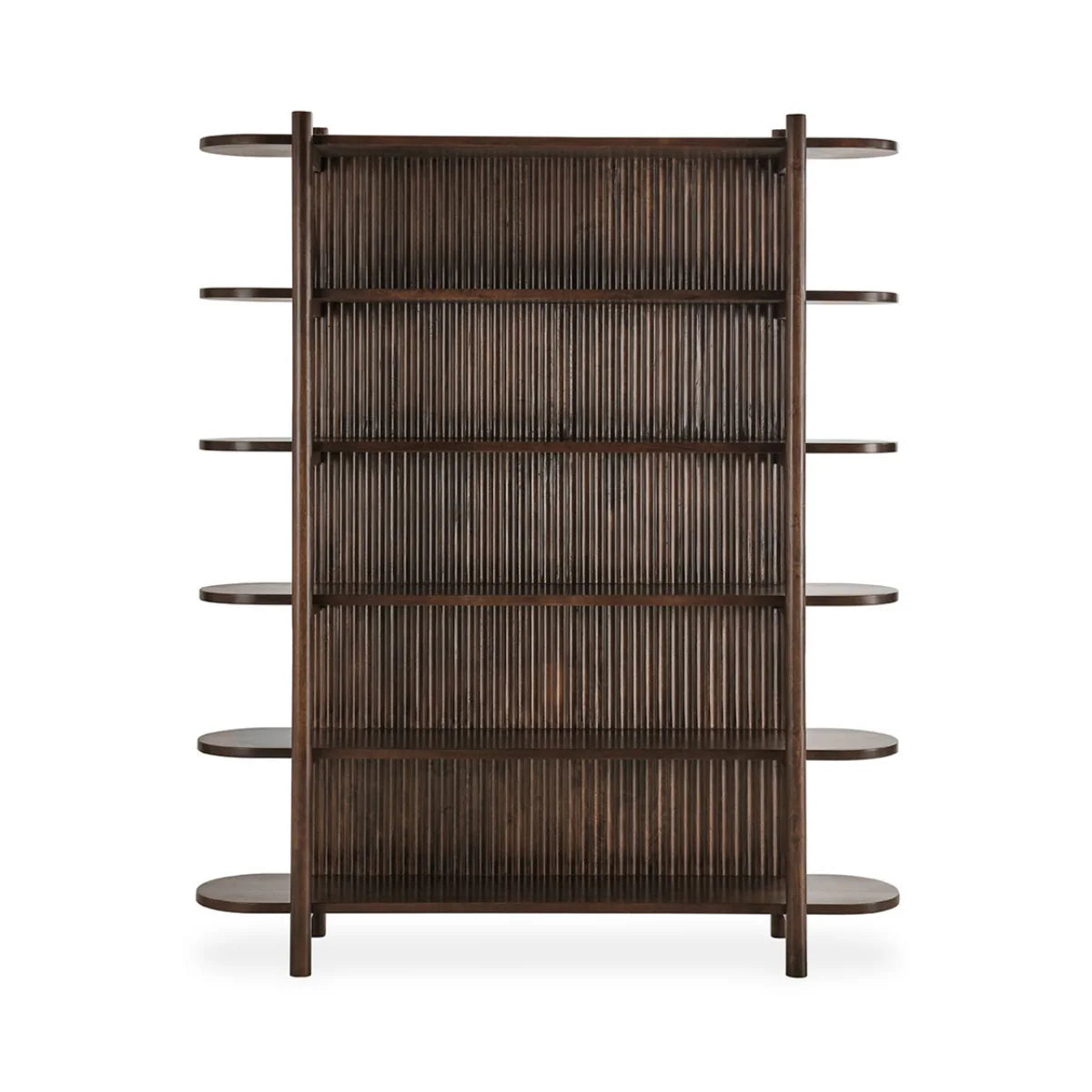 The Redford 81" Bookcase combines exquisite craftsmanship with practical design, made from durable mango wood that ensures lasting quality. Its distinctive fluted detailing and smooth round edges evoke a mid-century modern style, effortlessly elevating your living room or study decor. With generous shelving space, it offers ample room to organize books, display treasured collections, or showcase decorative accents. This bookcase not only enhances your interior with its timeless beauty but also provides a versatile storage solution tailored to your lifestyle. Add a stylish yet functional centerpiece that transforms your space with lasting elegance.