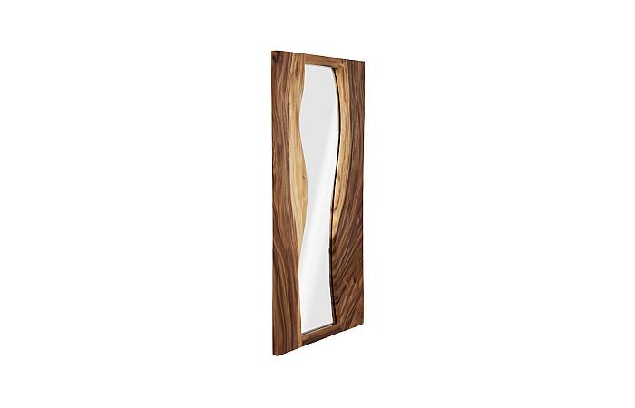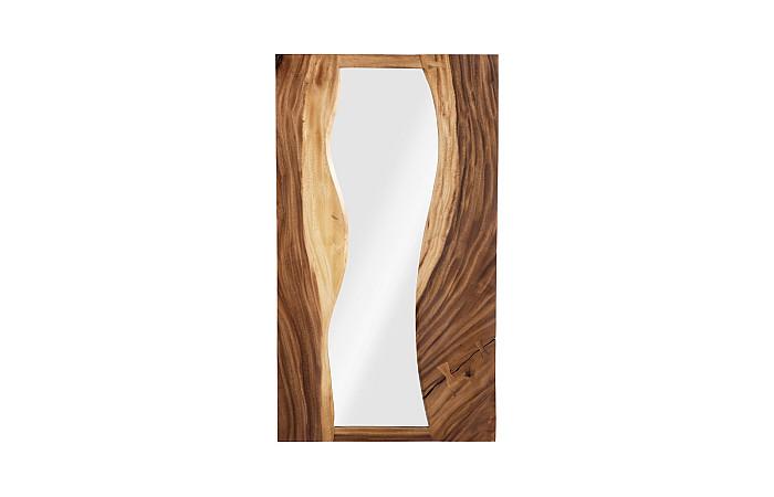 The River Chamcha Wood Mirror elegantly blends polished glass with warm wood, creating a striking contrast of materials. Crafted as both functional mirror and captivating wall art, its chamcha wood panels flow gracefully along the rectangular frame, showcasing the natural undulating grain perfected by nature. This piece exemplifies our commitment to sustainability by utilizing almost every segment of rescued trees. The interplay of natural textures and refined design embodies the modern organic spirit central to the Phillips Collection.