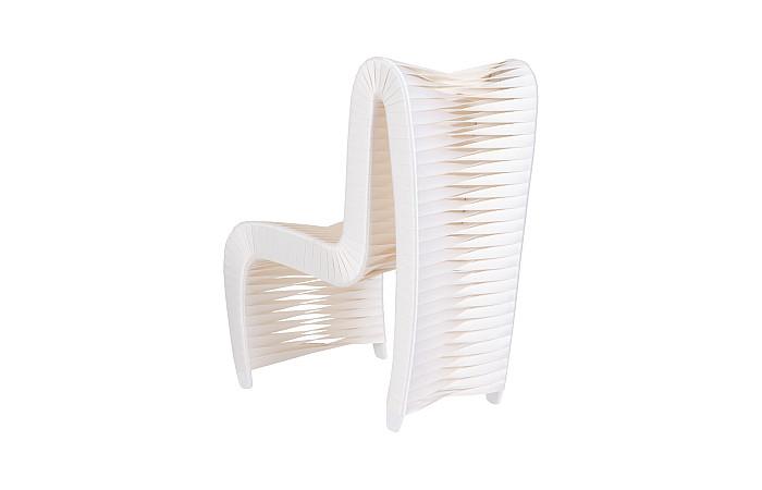The Seat Belt High-Back Dining Chair in black or white is a striking addition to the contemporary line by renowned Thai designer Nuttapong Charoenkitivarakorn. Inspired by the woven threads of seat belt factories, its signature braided backrest and sleek stiletto form showcase craftsmanship and modern elegance. The intricately woven straps rest on a sturdy wooden frame, enhanced with metal reinforcements for lasting strength and refined appeal.