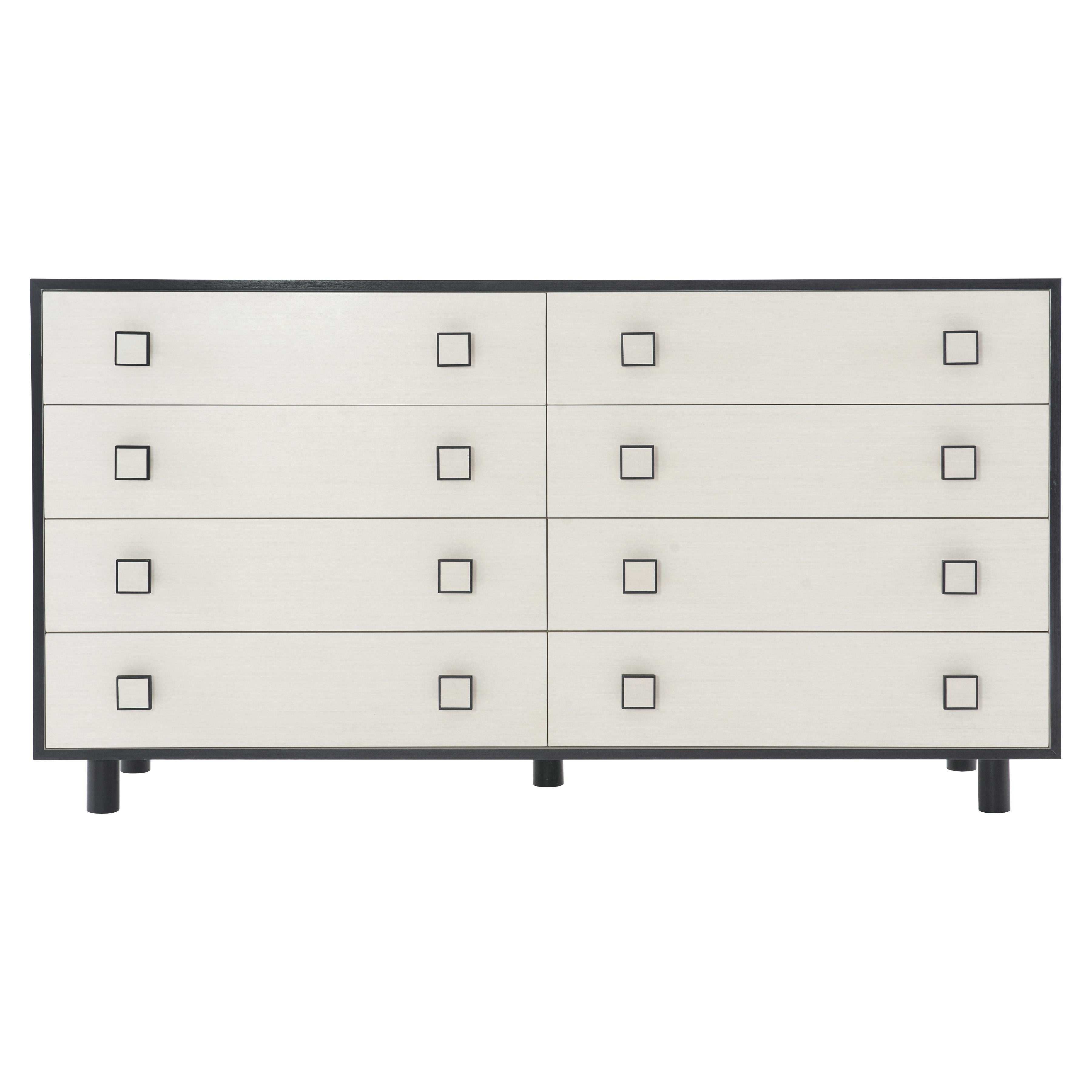 The Silhouette Dresser stands out with its striking blend of bold contrasts and sleek lines, effortlessly combining minimalist design with a touch of Hollywood Regency glamour. Its elegant black and white palette adds dramatic flair to any bedroom or living space, while the eggshell finish offers a smooth, refined look. Featuring eight spacious drawers, each equipped with distinctive two-tone square wood pulls, this dresser provides ample storage with style. The dark Onyx borders and cylindrical feet create a captivating contrast that enhances its sophisticated appeal, making the Silhouette Dresser a statement piece that elevates your home’s décor.