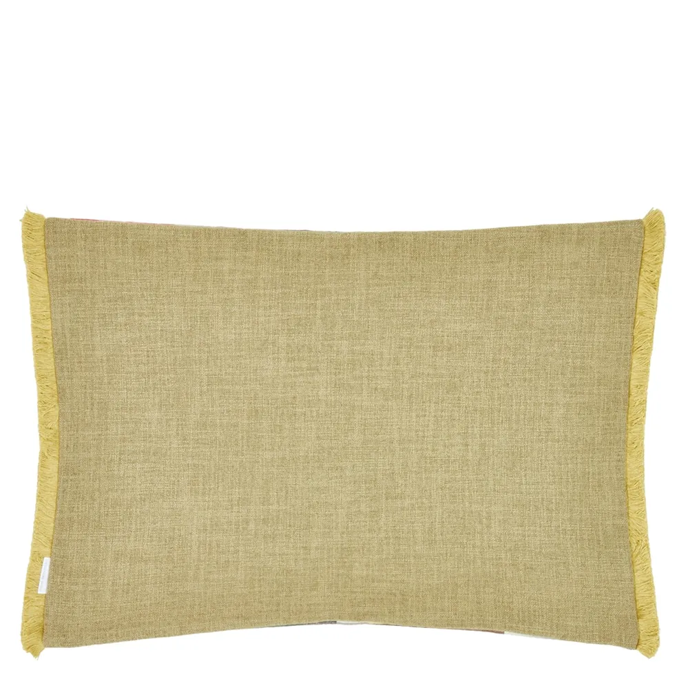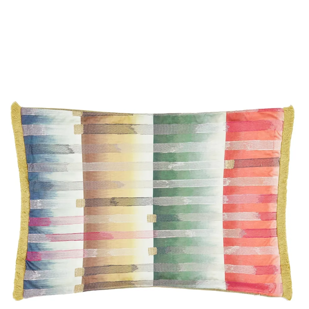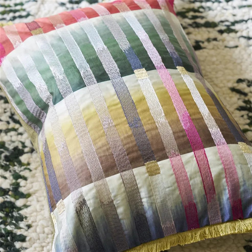 This sophisticated slate decorative pillow exemplifies contemporary design through its thoughtfully layered aesthetic. The foundation features digitally printed multi-colored shaded stripes rendered on premium pure cotton satin, creating a refined base that anchors the piece. Expertly embroidered contrasting stitched bands in fuchsia and moss elevate the surface, while delicate gold thread squares add luminous accents throughout. The reverse side showcases a complementary Carlyon olive tone, offering versatility in styling. Luxurious moss fringing adorns two sides, introducing texture and movement that enhances the pillow's visual depth. This combination of digital printing, hand-embroidered detailing, and quality materials makes it an ideal accent piece for curated interiors seeking both artistic expression and refined craftsmanship.